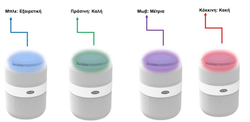 Устройството разпознава качеството на въздуха и светлинният индикатор променя цвета си в зависимост от нивото на чистота на въздуха: Отличен (син), добър (зелен), умерен (лилав), лош (червен)